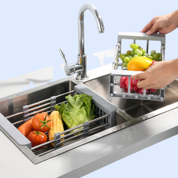 확장 가능한 수영장 물빠짐 식기 건조대는 다양한 크기의 식기에 맞춰 조절 가능하며, 물빠짐 구조로 위생적이고 공간 활용이 뛰어남.